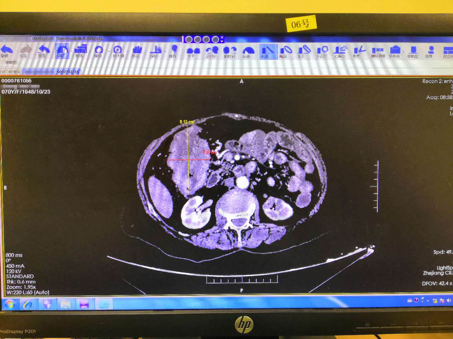 元旦这天,在孩子的陪同下我再次来到了慈林医院,求诊于消化内科。消化内科的医生听了我的描述也怀疑是肿瘤的复发,在随后的增强CT中发现了我的结肠肝曲域有一个4X8X6的巨大肿瘤。