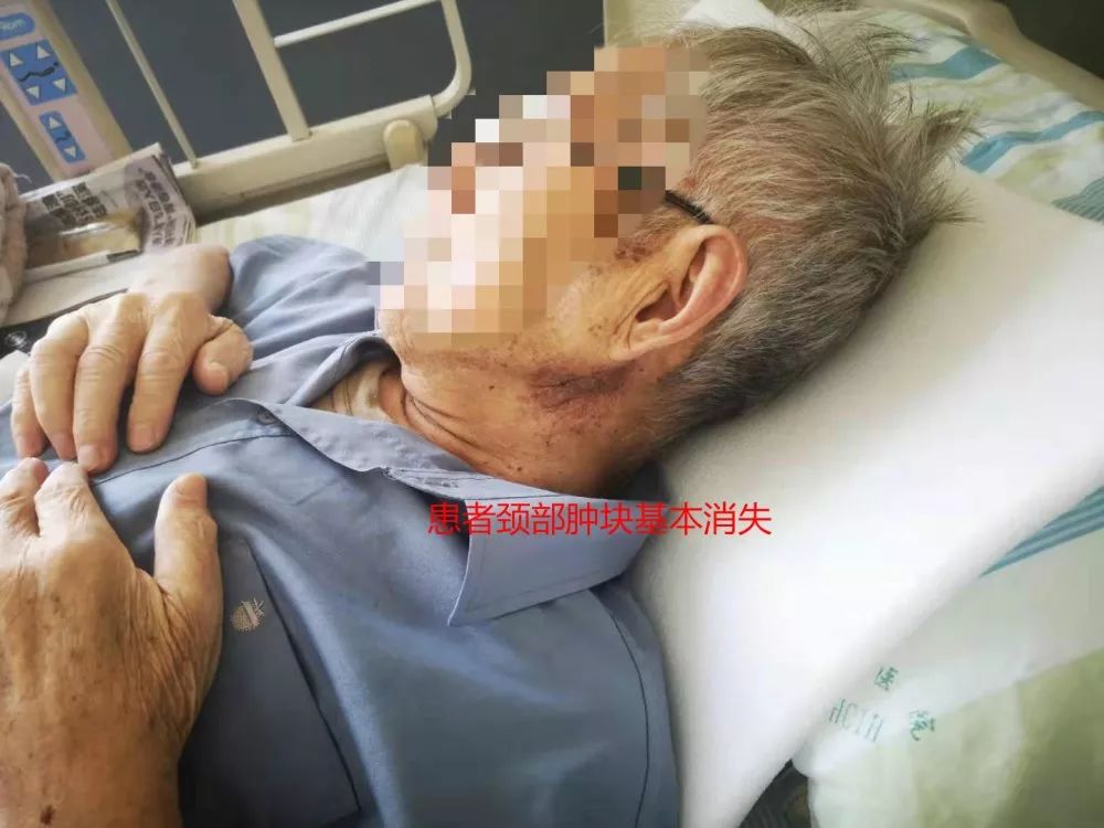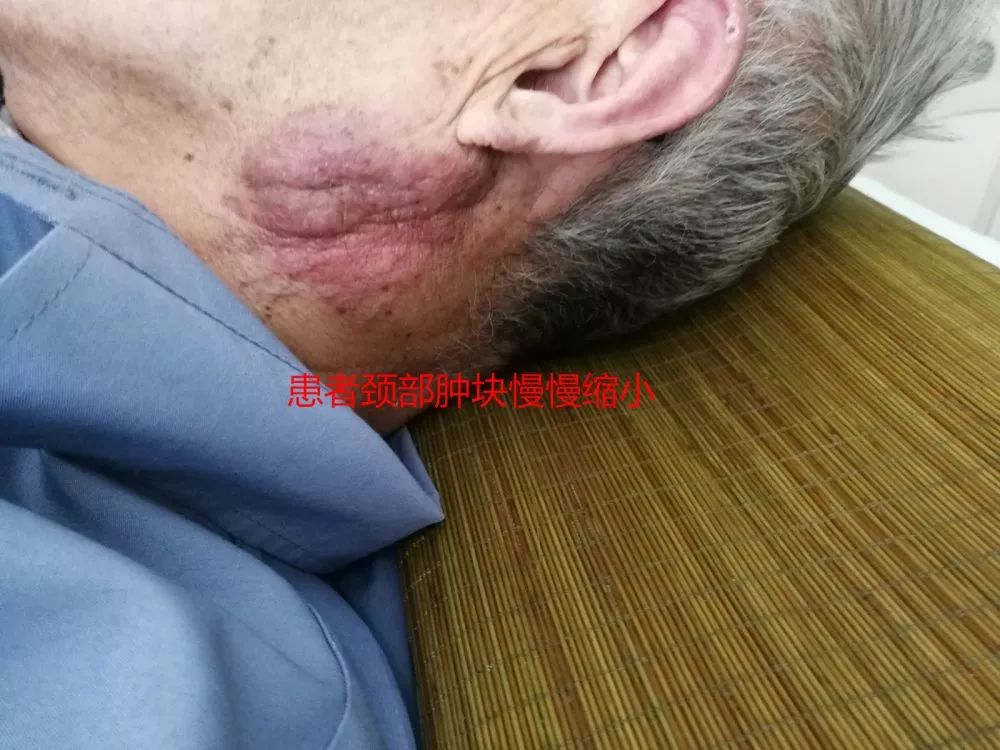 经过20余天的治疗,奇迹发生了:患者原本颈部硕大无比的肿瘤缩小了下去,肿胀的腹部也慢慢趋于好转。患者的精神状态得到了很大的改善,吃得下东西。