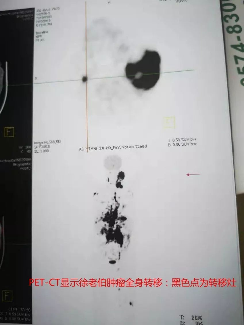 今年6月开始,他的病情进一步加重,高热不退、胸腔腹腔积水严重、双腿肿胀、不思进食,PET-CT显示,徐老伯的肿瘤已经出现全身转移,生命垂危。各地医生们均委婉告知,治疗已经意义不大。7月,抱着最后一线希望,他们来到慈林医院肿瘤内科就诊。